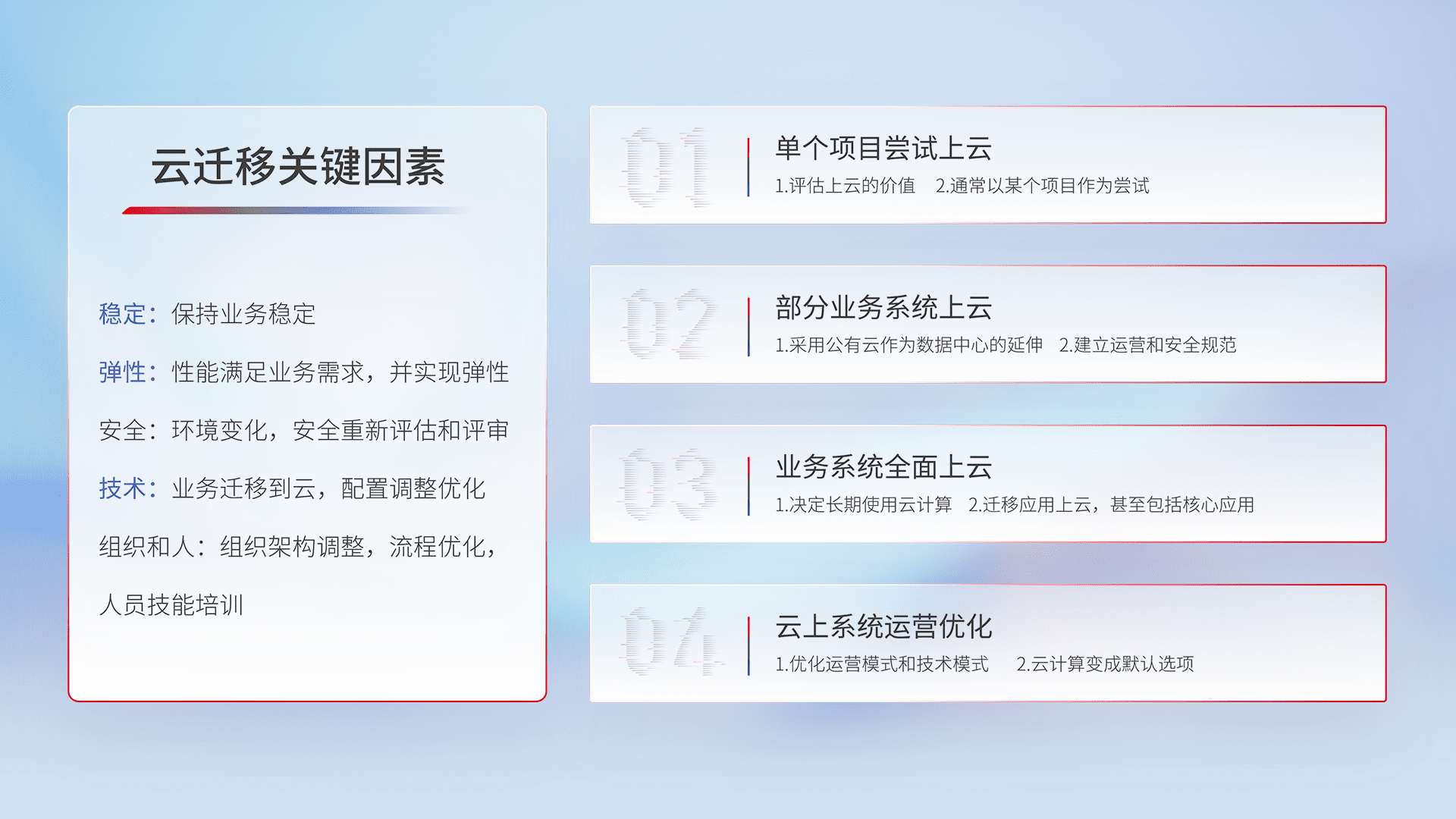 结合实际业务,,,从规划设计、、云平台选型、、、、云原生改造、、数据迁移、、集成交付,,,迁移全过程为客户识别最佳上云路径,,做好风险识别管理,,,设计网络架构、、、、身份权限、、、安全审计合规、、操作审计、、日志审计、、、监控告警策略、、多站点容灾设计等,,,对云上基础设施进行整体规划,,提升IT治理水平,,,以满足弹性、、高可用、、、、高性能的需求。。